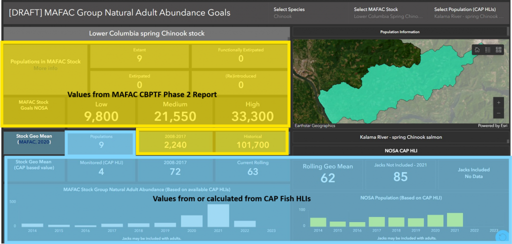 StreamNet Executive Committee members directed StreamNet staff to develop a tool that would easily provide access to CAP Fish HLIs natural-origin spawner and escapement estimates by displaying population estimates as part of the 27 fish stock groups identified by the CBPTF. Working with the Pacific Northwest Aquatic Monitoring Partnership’s Fish Monitoring Work Group and its committees, StreamNet developed this dashboard to display CBPTF Phase 2 (Final) Report’s goals, geo-means, and related estimates from the CAP Fish HLIs query.
